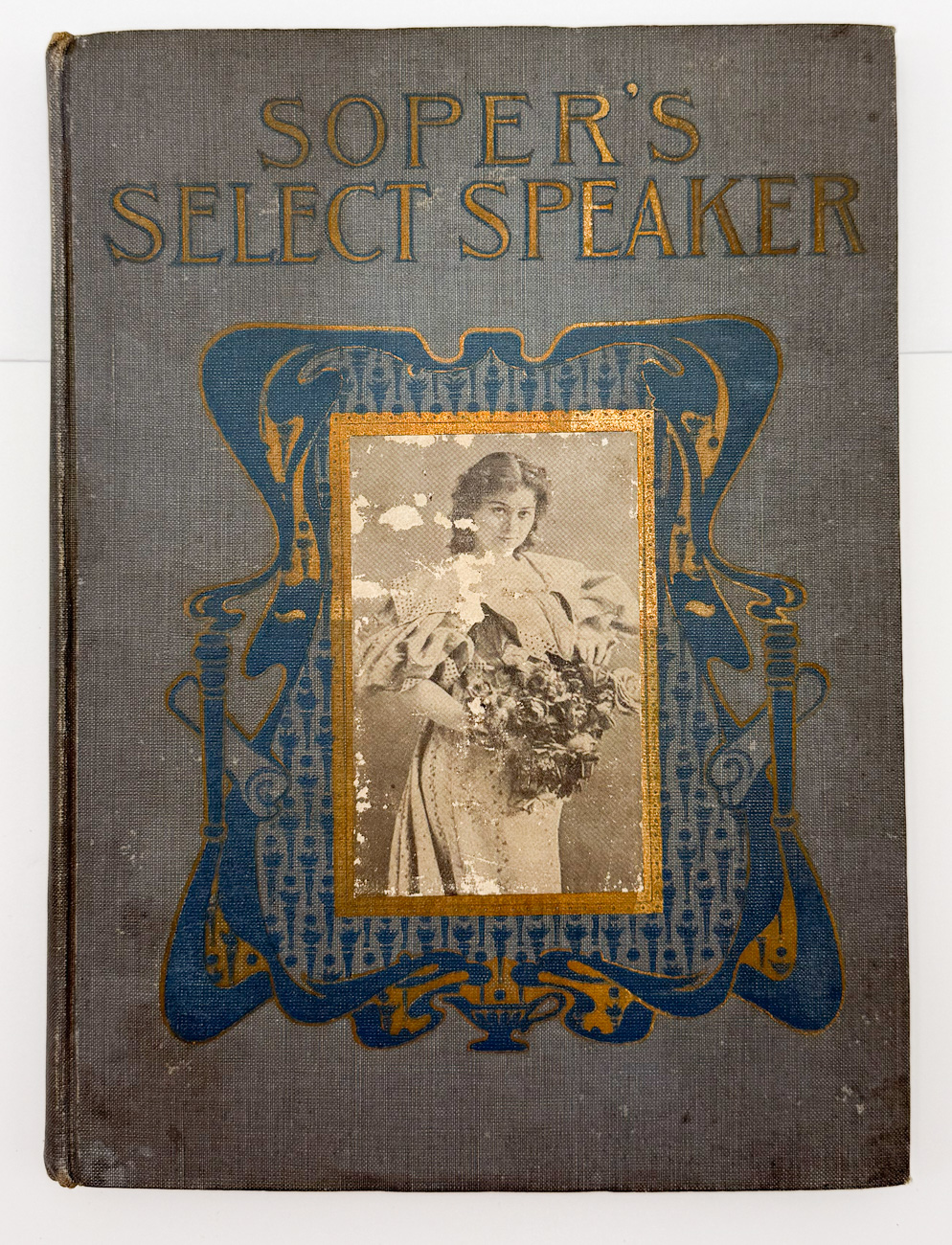 Abridged salesman’s sample editions with reduced interior content and full table of contents referencing the complete volume; pricing and marketing information printed on rear pages, followed by multiple clean, ruled ledger pages intended for sales-agent notetaking. (2 samples: Soper's Select Speaker and Social Culture)