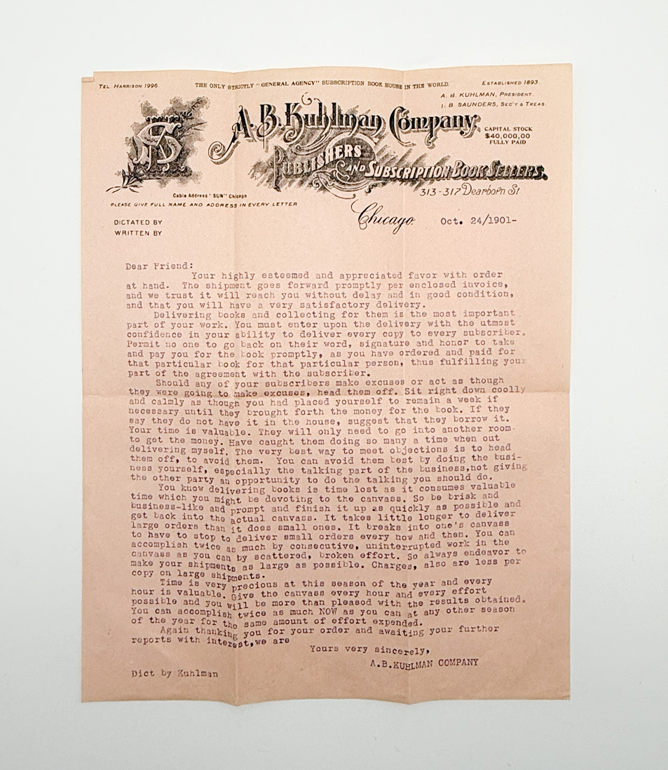 The materials are anchored in Chicago-based publishing entities that dominated subscription book distribution during this period. Central to the collection are two original publisher sales kits designed for traveling sales agents, along with associated correspondence, order forms, freight instructions, invoices, and sales directives. Together, these materials provide a rare, integrated view of early twentieth-century domestic book selling as a coordinated commercial system rather than an isolated retail practice.
